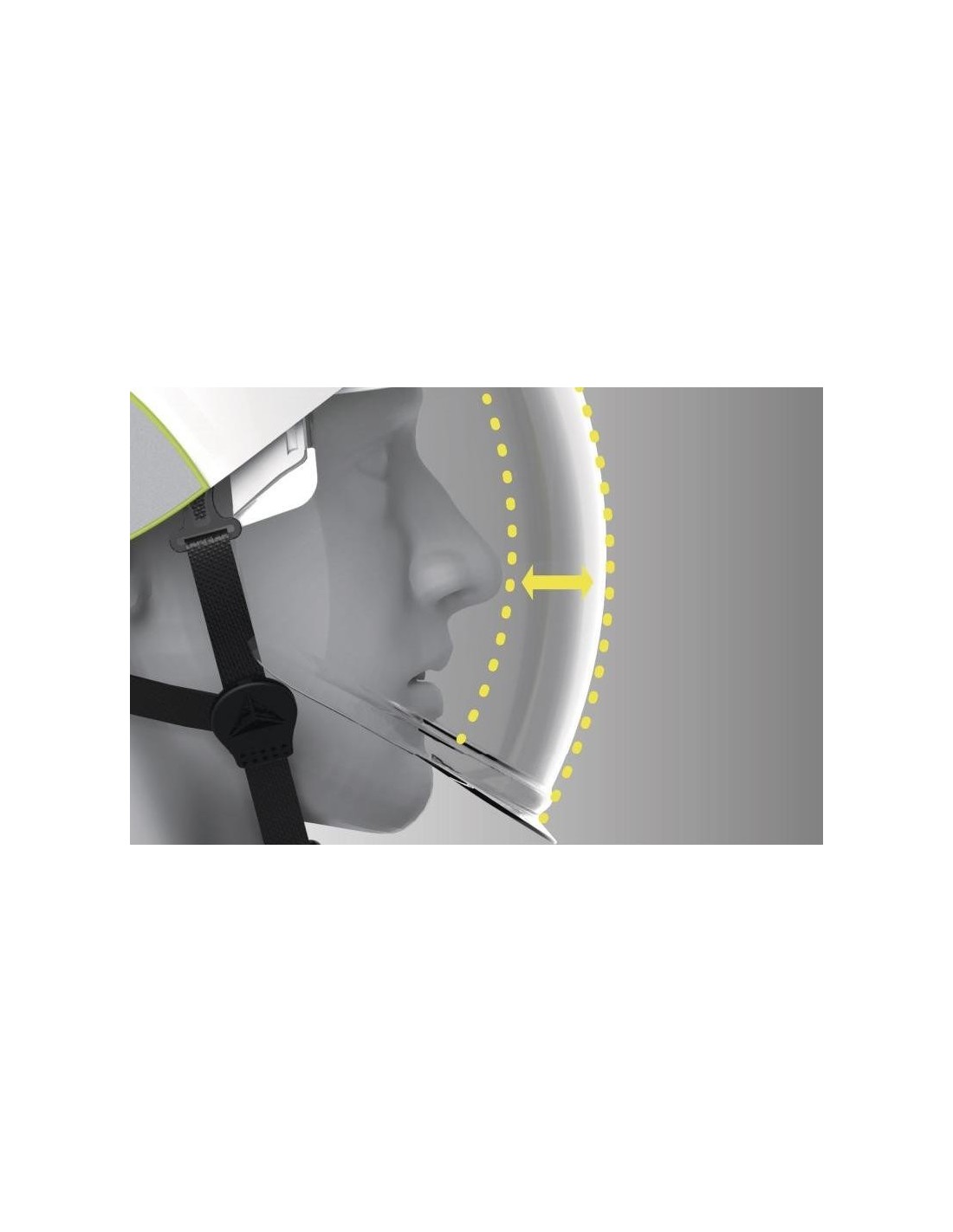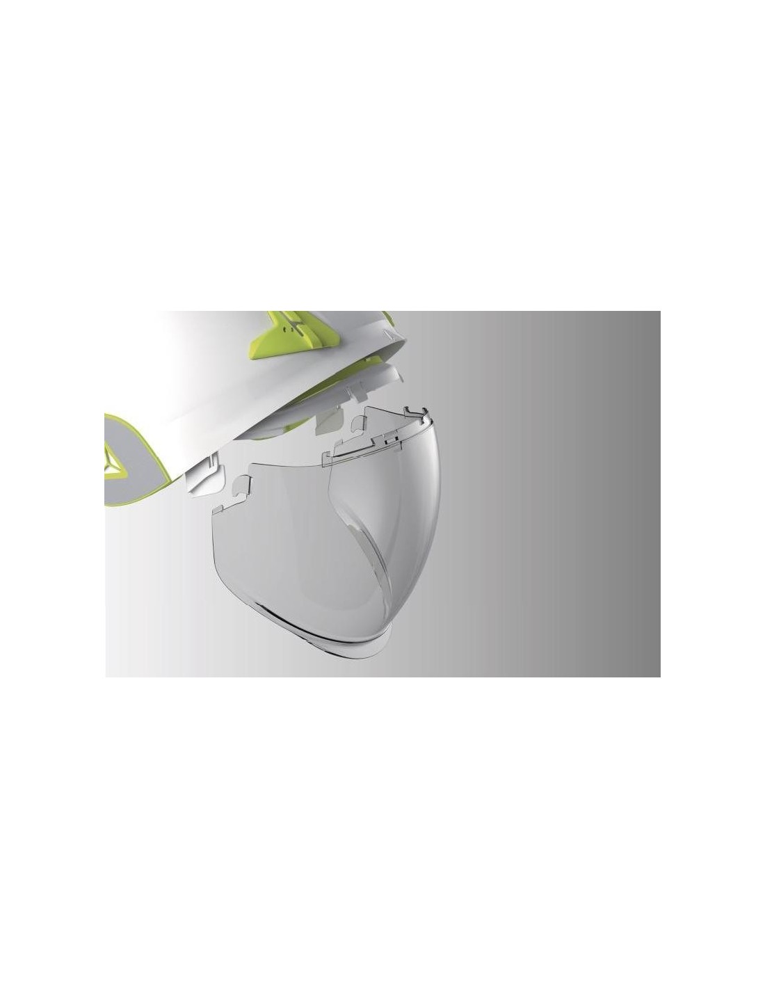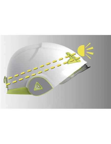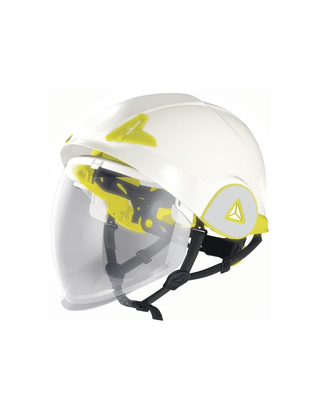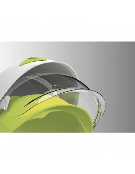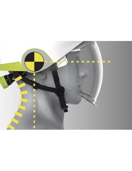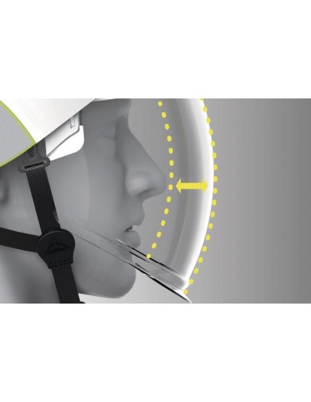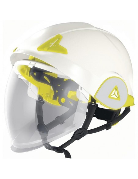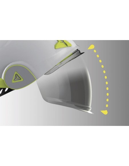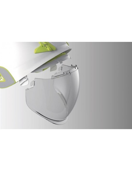 Cască de protecţie carcasă dublă ABS, ham de susţinere cu 3 benzi textile şi 6 puncte de fixare, bandă antitranspiraţie din spumă, sistem de prindere reglabil cu buton One-D Rotor pentru dimensiuni cuprinse între 53-63 cm, sticker retro-reflectorizant, vizieră din policarbonat retractabilă, tratată anti-ceaţă N şi anti-zgâriere K şi cu protecţie împotriva arcurilor electrice şi a proiecţiilor de metale topite sau lichide fierbinţi, rezistentă la temperaturi cuprinse între -20°C şi +50°C. Izolaţie electrică de la 1000 VAC la 1500 VDC.