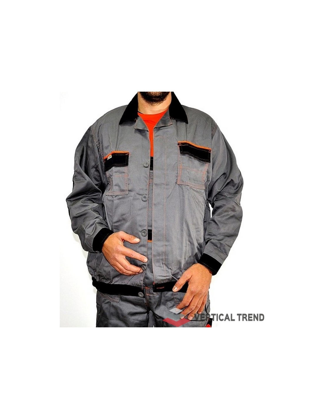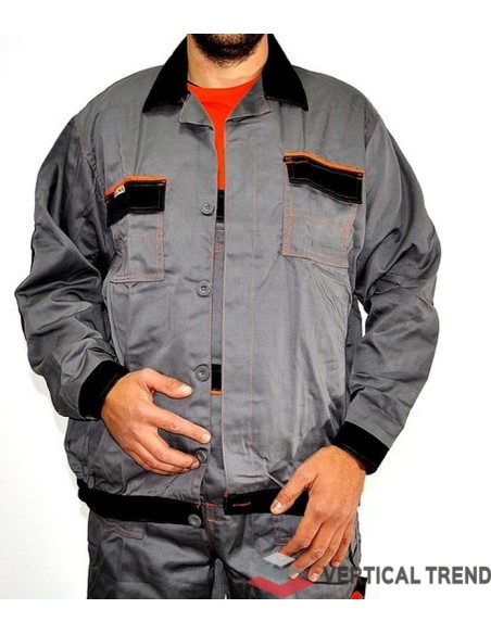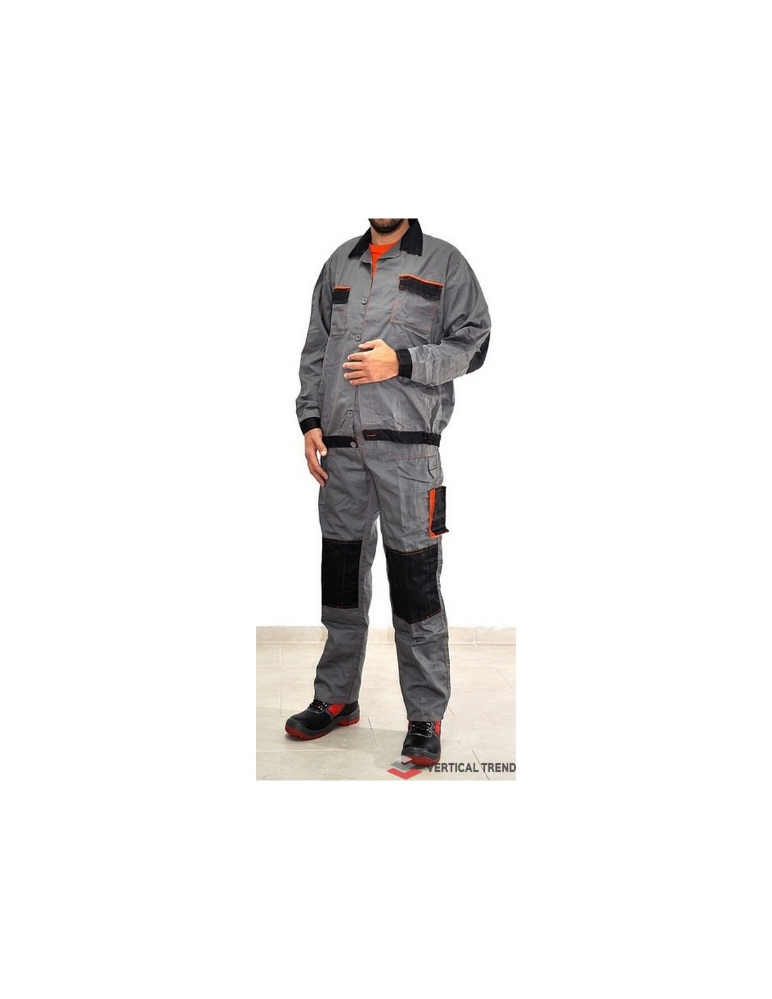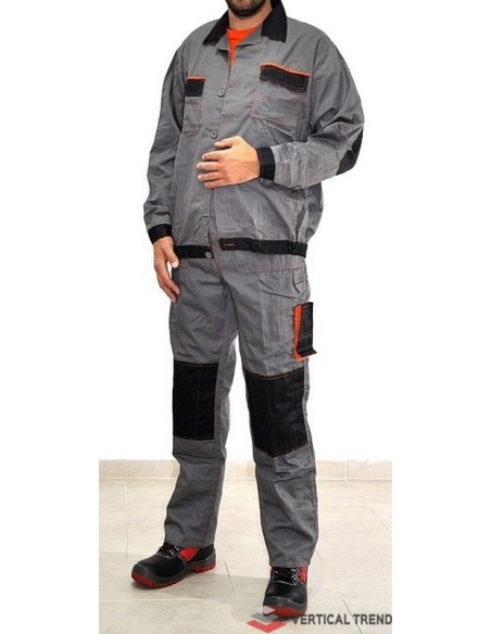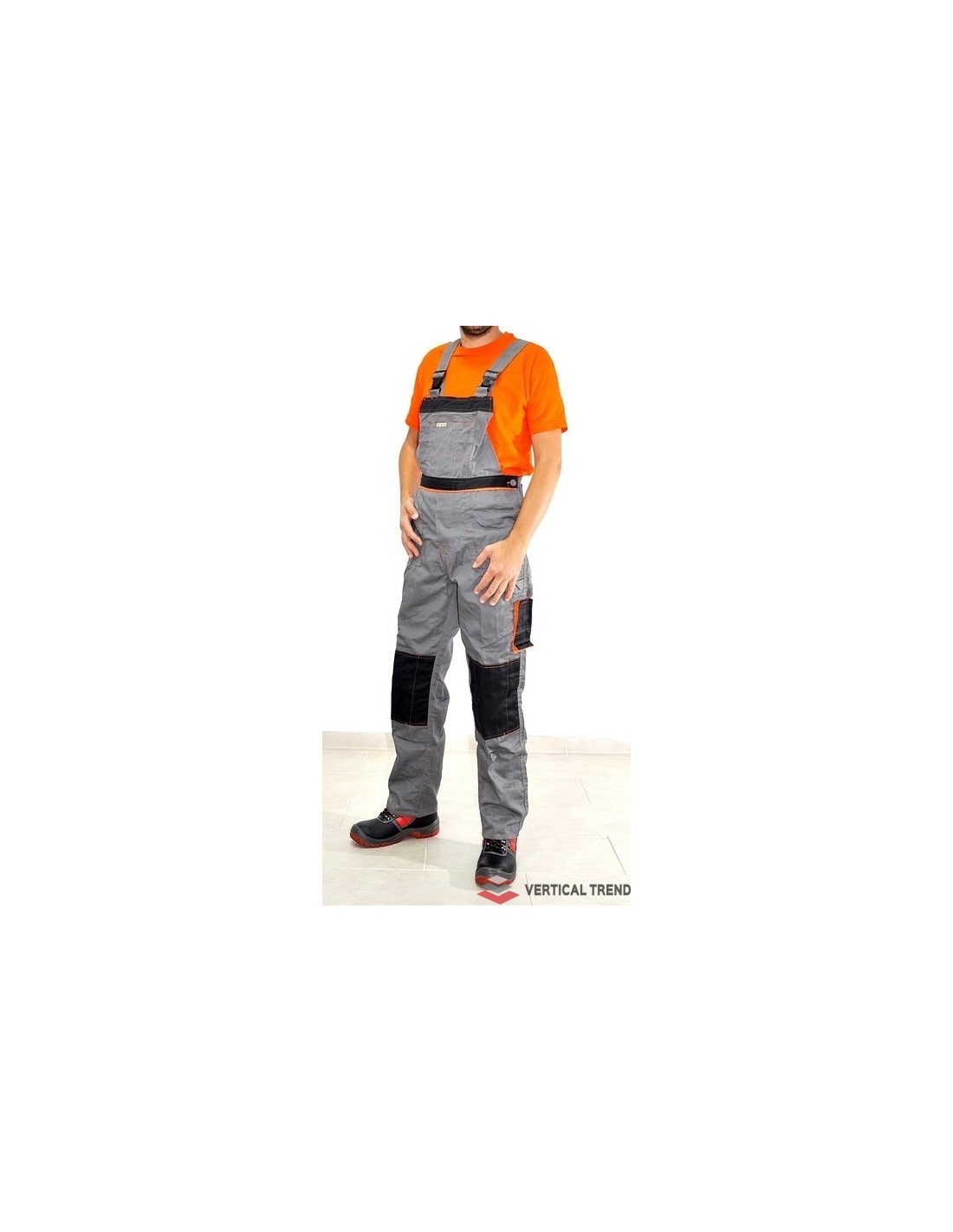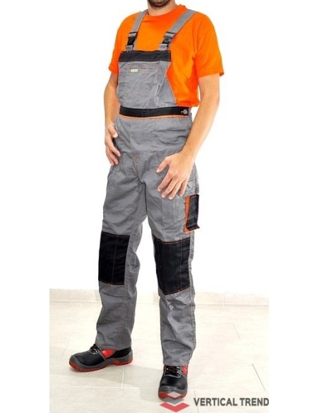 Salopetă cu pieptar din tercot, combinaţie de culori gri-negru, densitatea materialului de 280 gr/m², bluza cu 2 buzunare la piept, elastic în talie şi mâneci cu mansetă reglabilă, pantaloni cu închidere cu tridenti, 3 buzunare în dreptul pieptului ( unul cu închidere cu fermoar ) şi două în partile laterale,