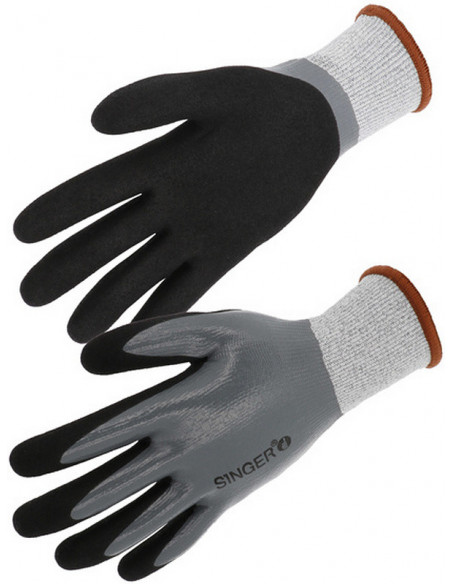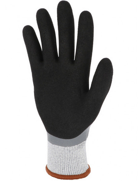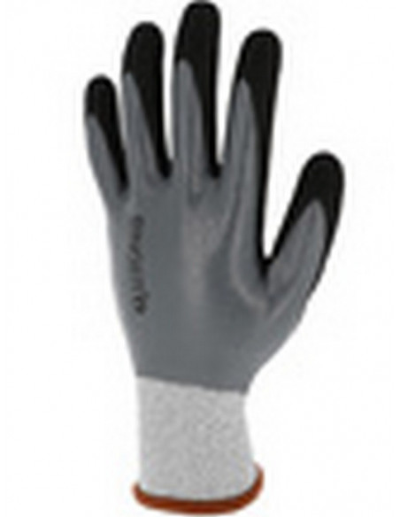 Mănuşi rezistente la taieturi tricotate din fir HPPE, acoperite 3/4 cu un strat de spumă de nitril în palmă şi pe degete şi pe spate, iar al 2-lea strat confera o aderenţă sporită. Manșetă tricotată elastică.