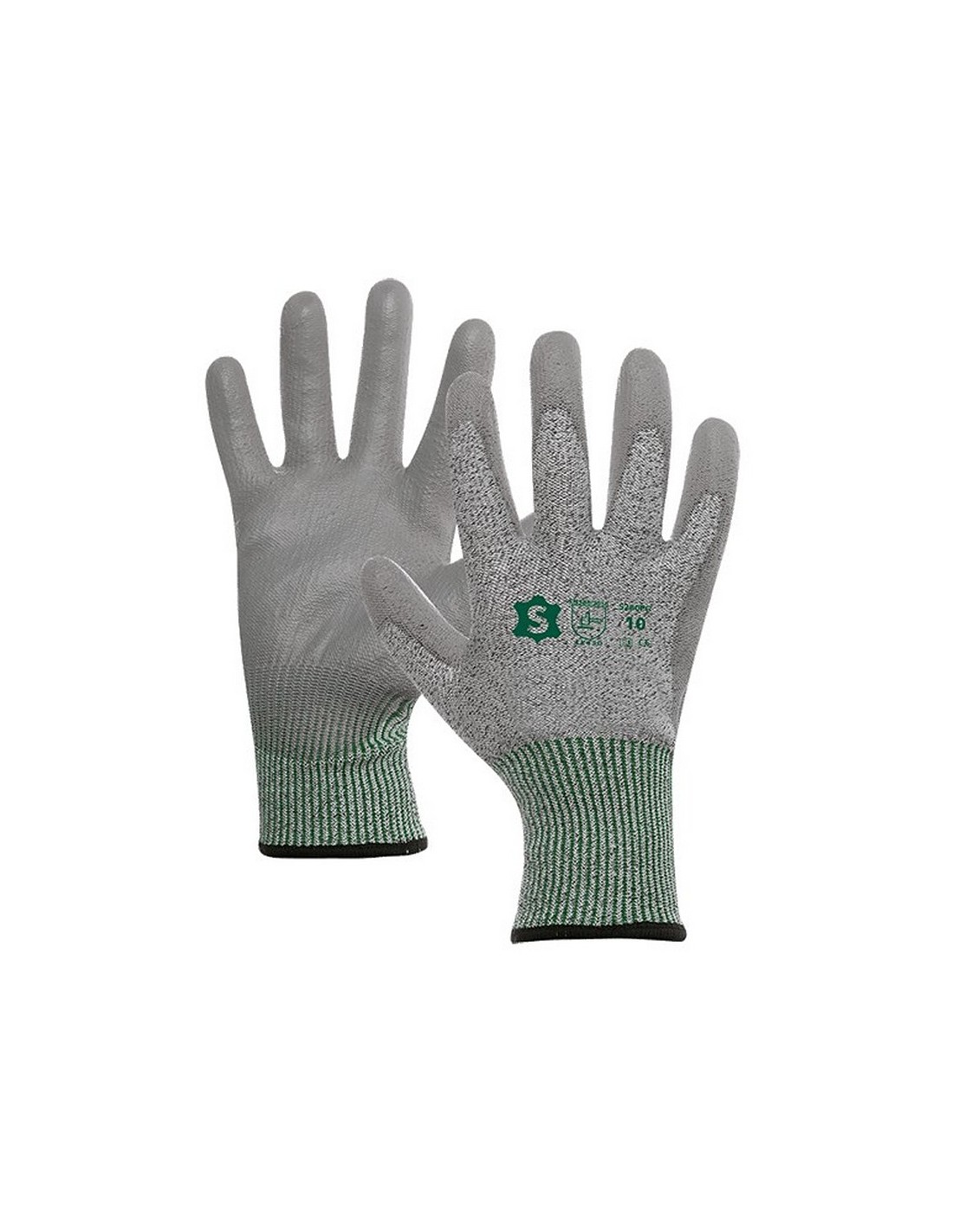 Mănuși antităiere tricotate dintr-un amestec de fibre (HPPE, PE, fibră de sticlă, spandex) imersate în poliuretan în palmă și pe degete, manșetă elastică.