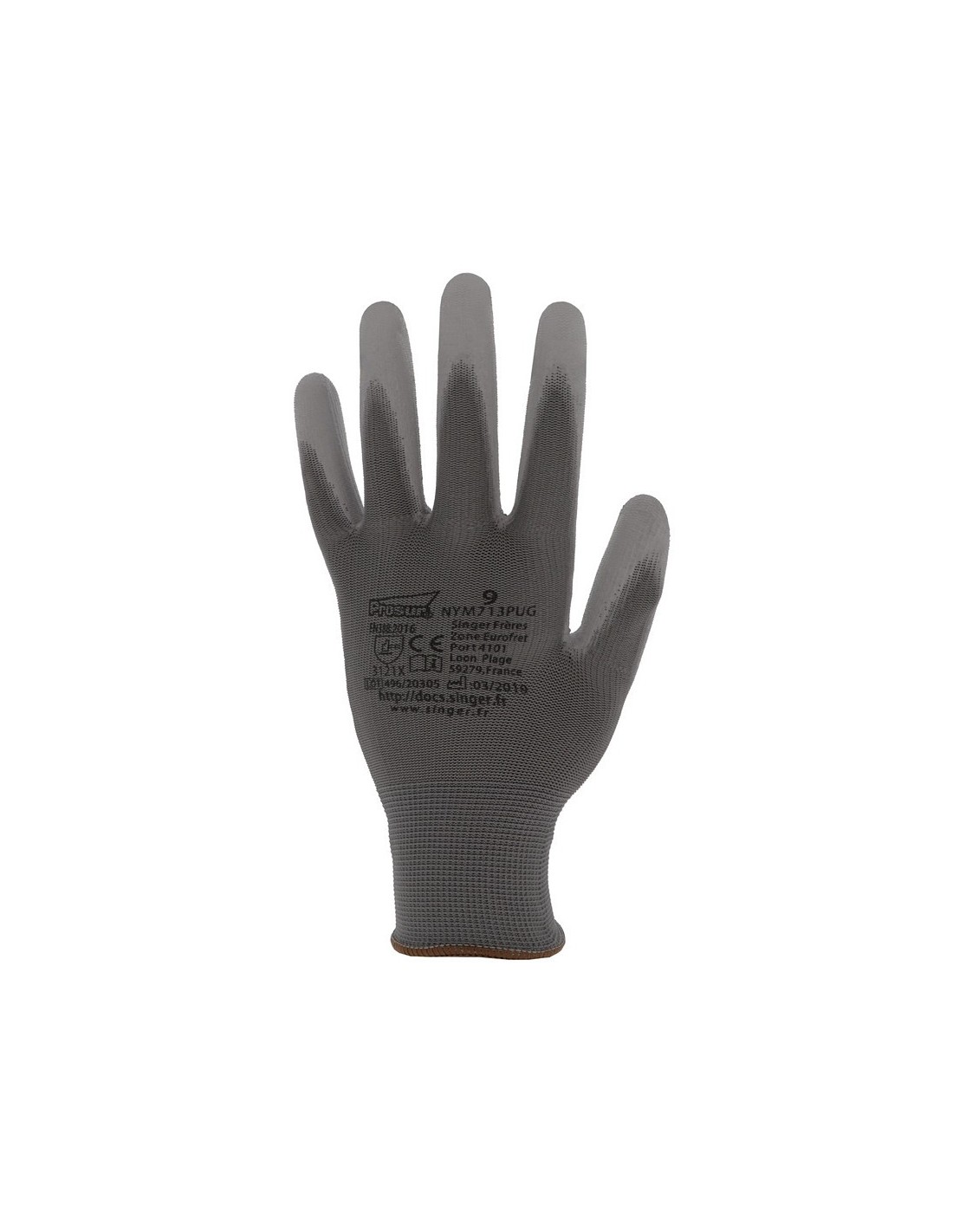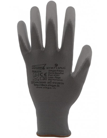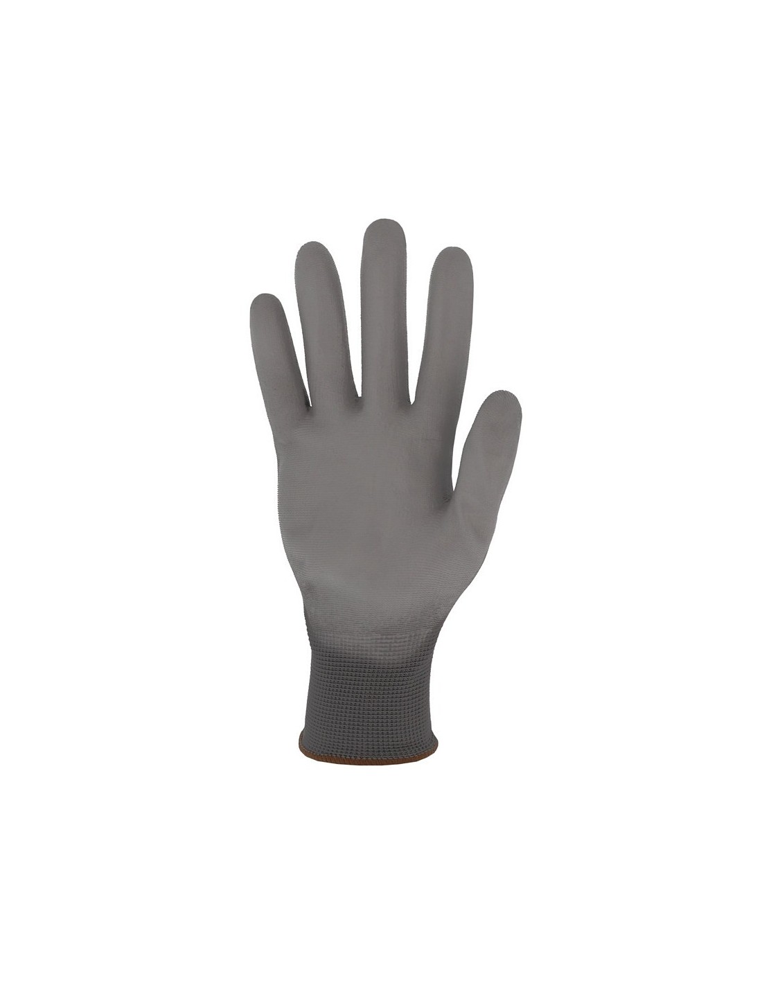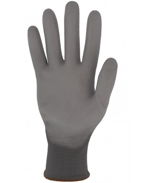 Mănuși tricotate dintr-o singură bucată, din poliester, palma și degetele acoperite cu poliuretan, dos aerisit, manșetă tricotată elastică. Culoare: gri. Marimi: 6-11.