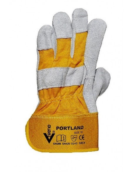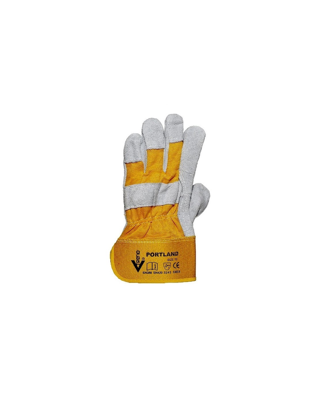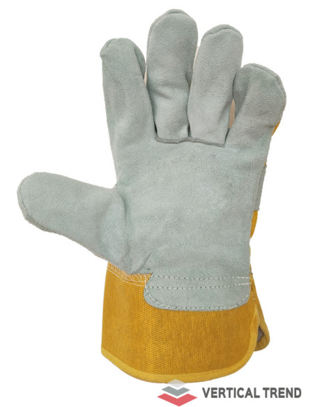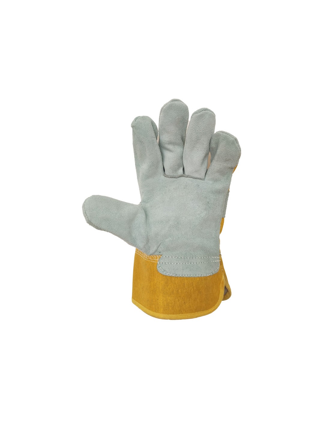 Mănuşi lăcătuş din piele şpalt bovină, manşetă cauciucată, fără cusături în palmă, dos din bumbac cu elastic pentru reglare pe mână. EN 388 (3243).
