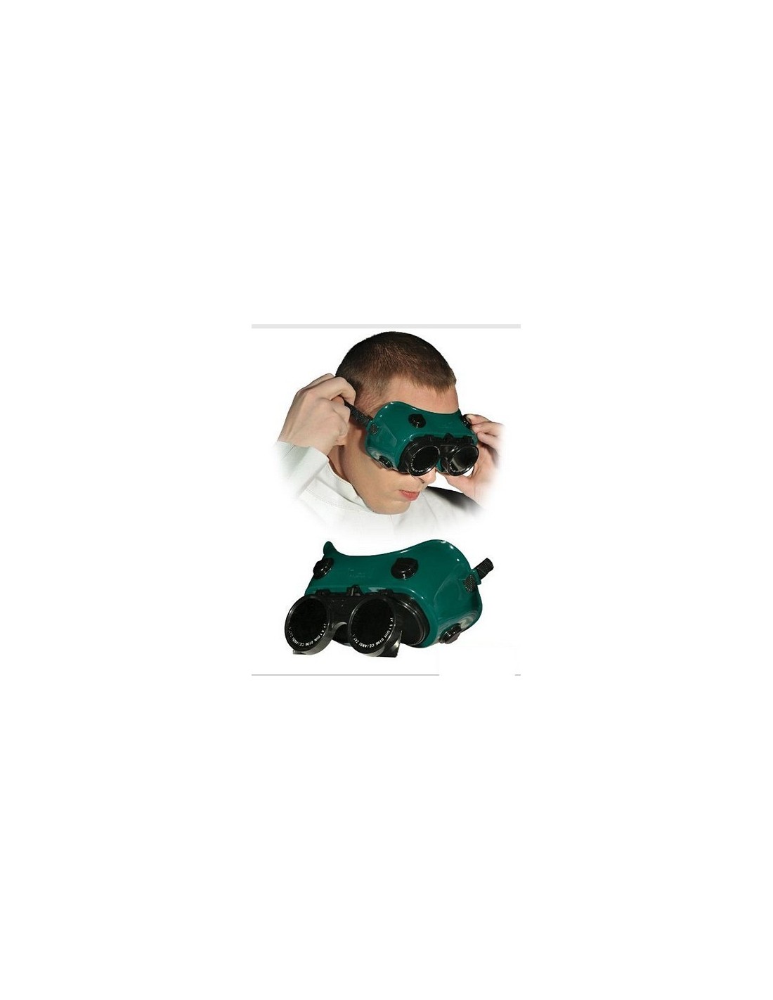 Ochelari de protecţie cu lentile rotunde, realizate din sticlă optică de clasa 1. Corp din material plastic, lentile clare montate fix în corp, lentile întunecate şi care se pot înlocui montate într-o ramă rabatabilă. Ajustare pe cap cu o bandă elastică.