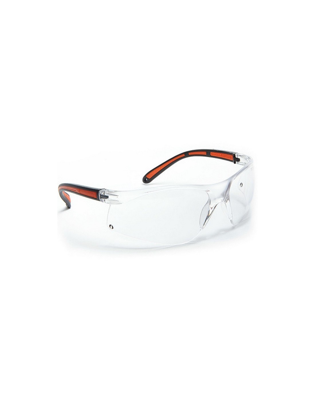 Ochelari de protecție cu lentile transparente din policarbonat, antizgâriere și antiaburire, protecție UV, ușor curbate pentru a oferi un câmp vizual larg, brațe laterale bicolore, dublu injectate din TPR și policarbonat, asigură o potrivire perfectă pe față, pad nazal turnat din policarbonat, puncte de fixare pe brațele laterale pentru șnur, grosimea lentilei 2 mm, greutate 24 gr.