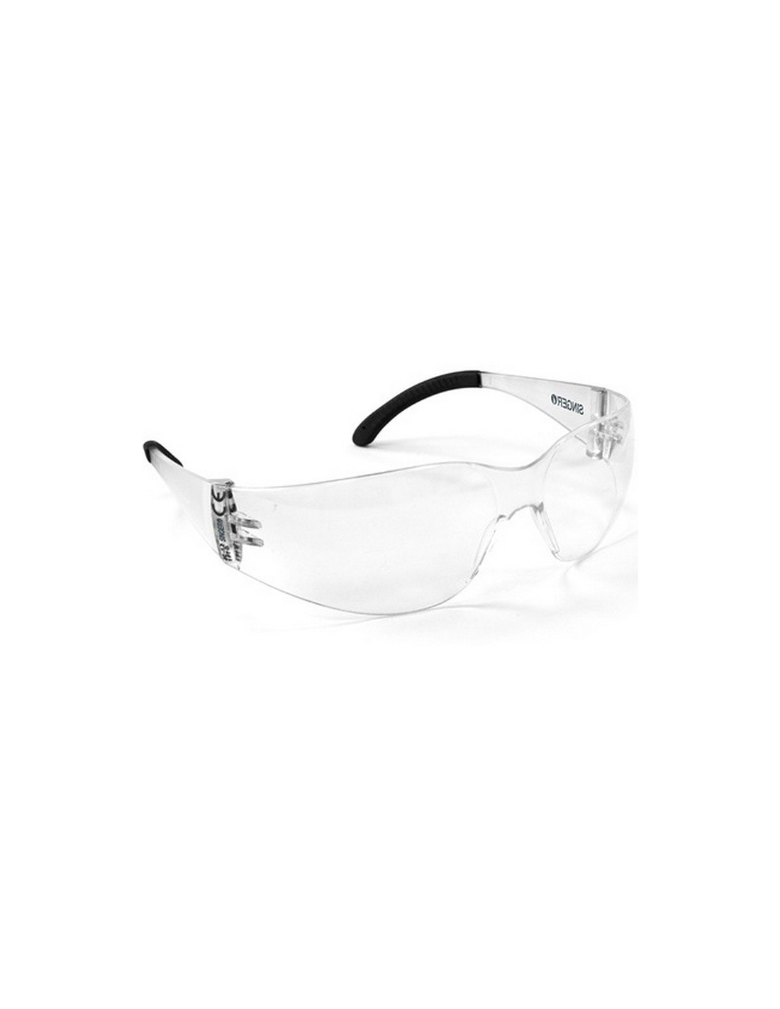 Ochelari de protecție cu lentile transparente curbate, din policarbonat și TPR, antizgâriere, protecție UV, brațe laterale și cadru din policarbonat, pad nazal turnat, grosimea lentilei 2 mm, greutate redusă 27 gr.