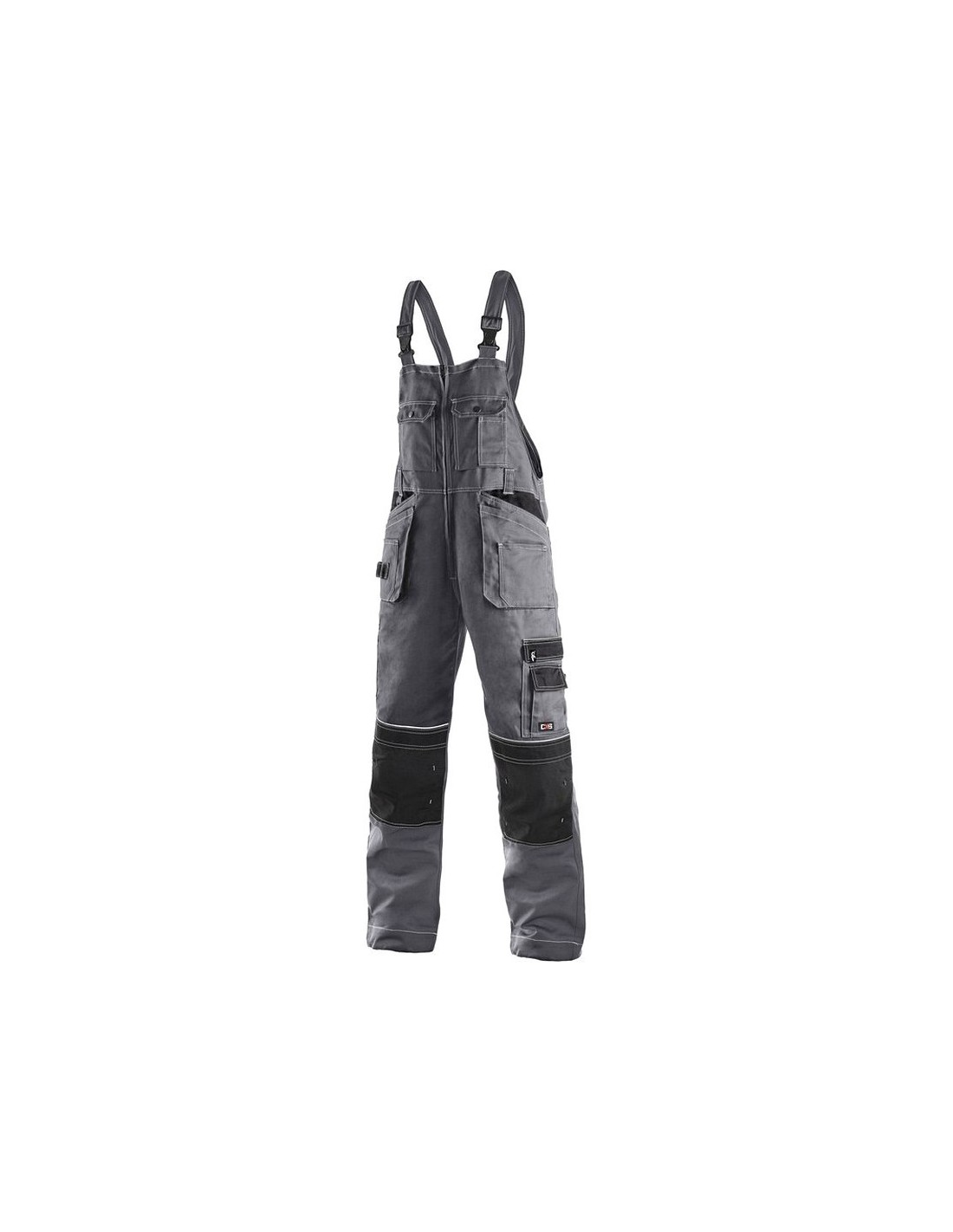 Pantaloni de lucru cu pieptar din tercot 60 % bumbac şi 40% poliester. Densitate: 280 g/m2. Cu întărituri la genunchi, cu posibilitatea de a insera genunchere. Buzunare laterale multifuncţionale, buzunare în faţă şi găici pentru unelte. Accesorii reflectorizante. Combinaţii de culori: albastru-negru, gri-portocaliu, portocaliu-gri