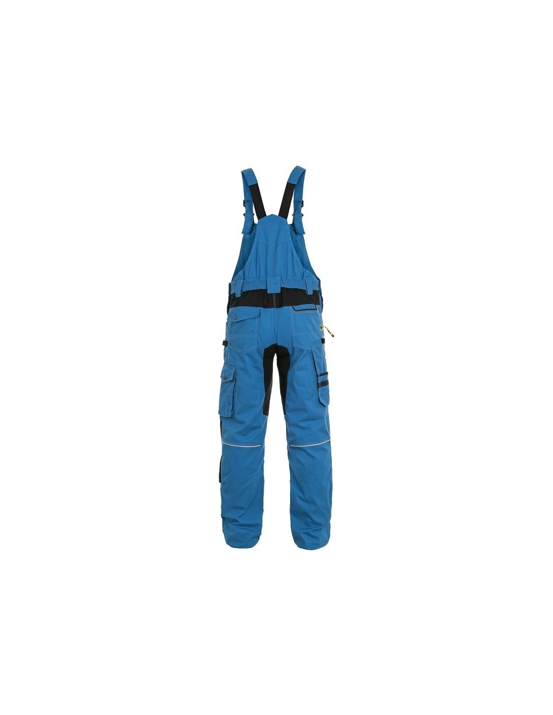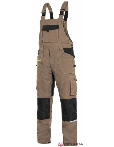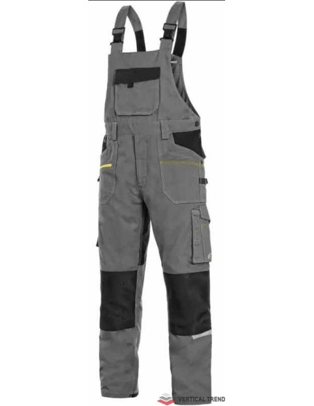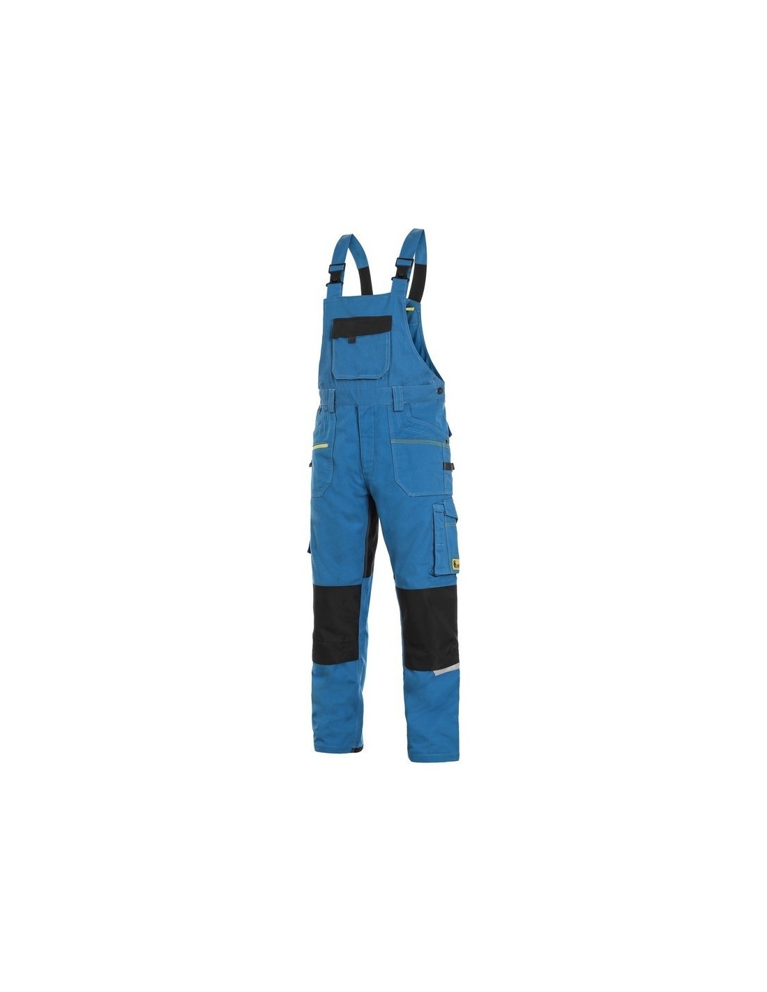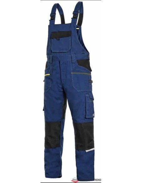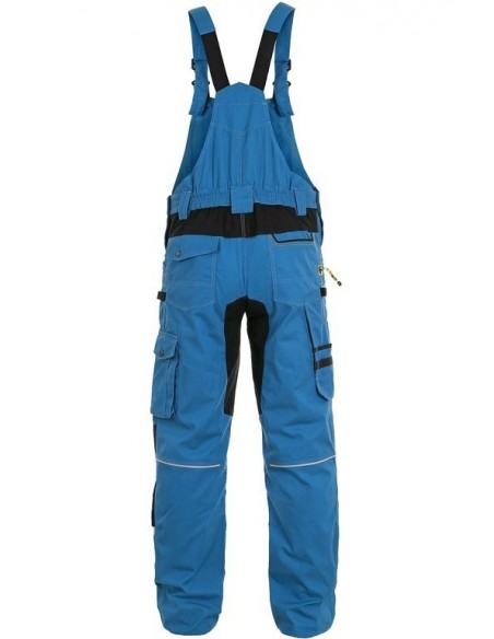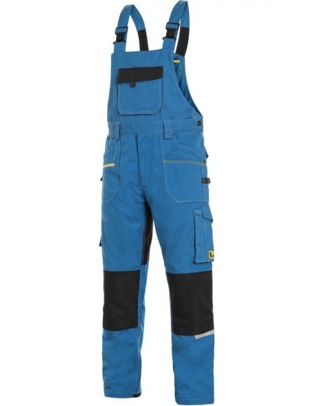 Pantaloni de lucru cu pieptar, confecționați din amestec usor elastic canvas 98% bumbac cu 2% elastan, densitate material 250g/mp, buzunar cu clapetă pe piept, talie cu găici de curea, buzunare frontale cu buzunar cu fermoar, buzunare multifuncționale pe ambele părți, întăriți cu poliester 600D, cu deschidere pentru genunchiere, două buzunare la spate - unul cu clapă, tiv inferior posterior întărit cu poliester 600D, elastic, accesorii reflectorizante, culori: albastru-negru, bleumarin-negru, bej-negru, gri-negru