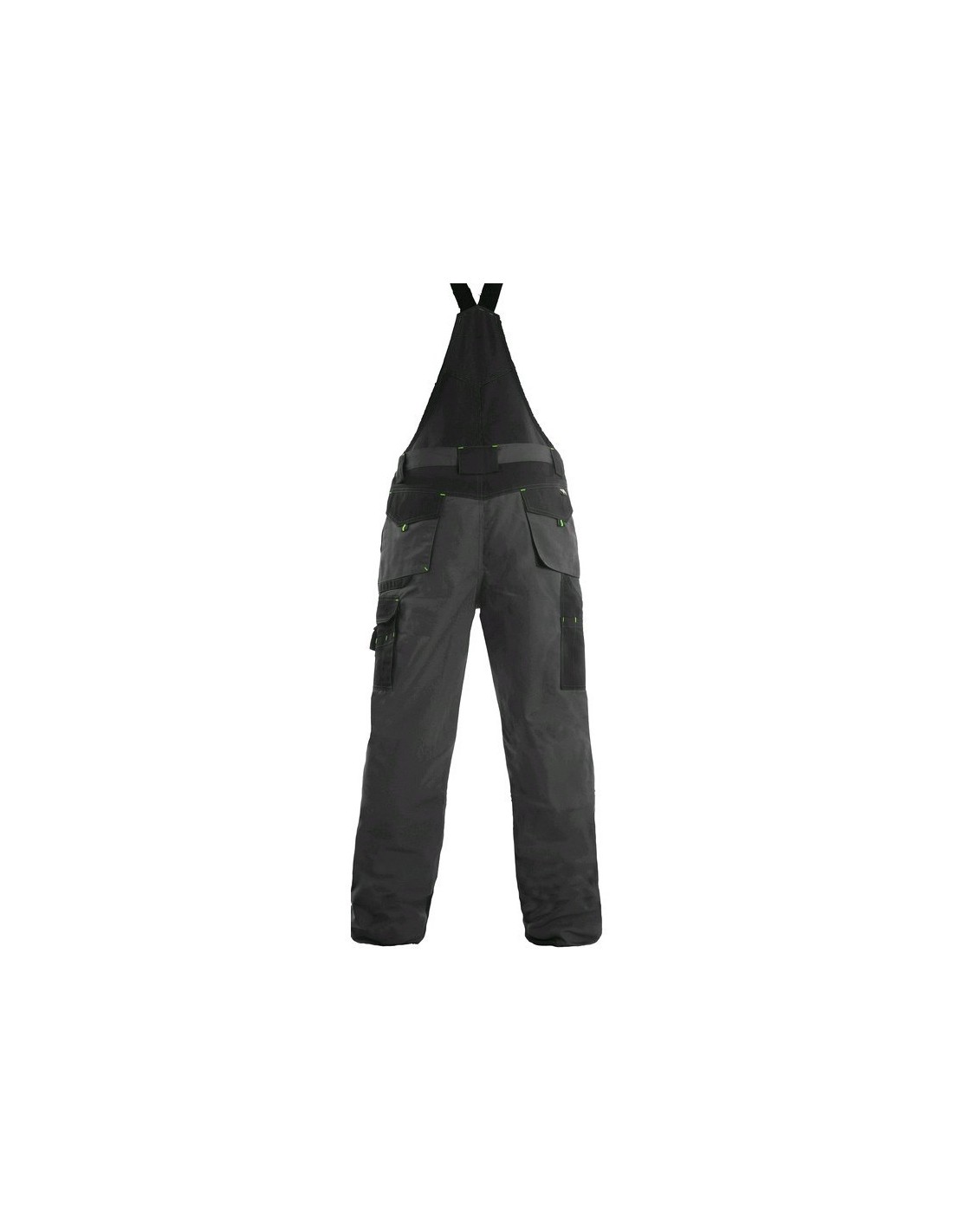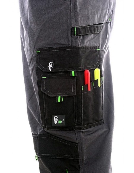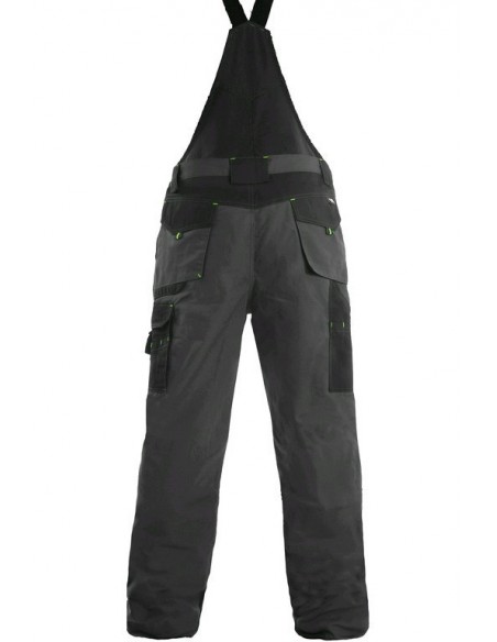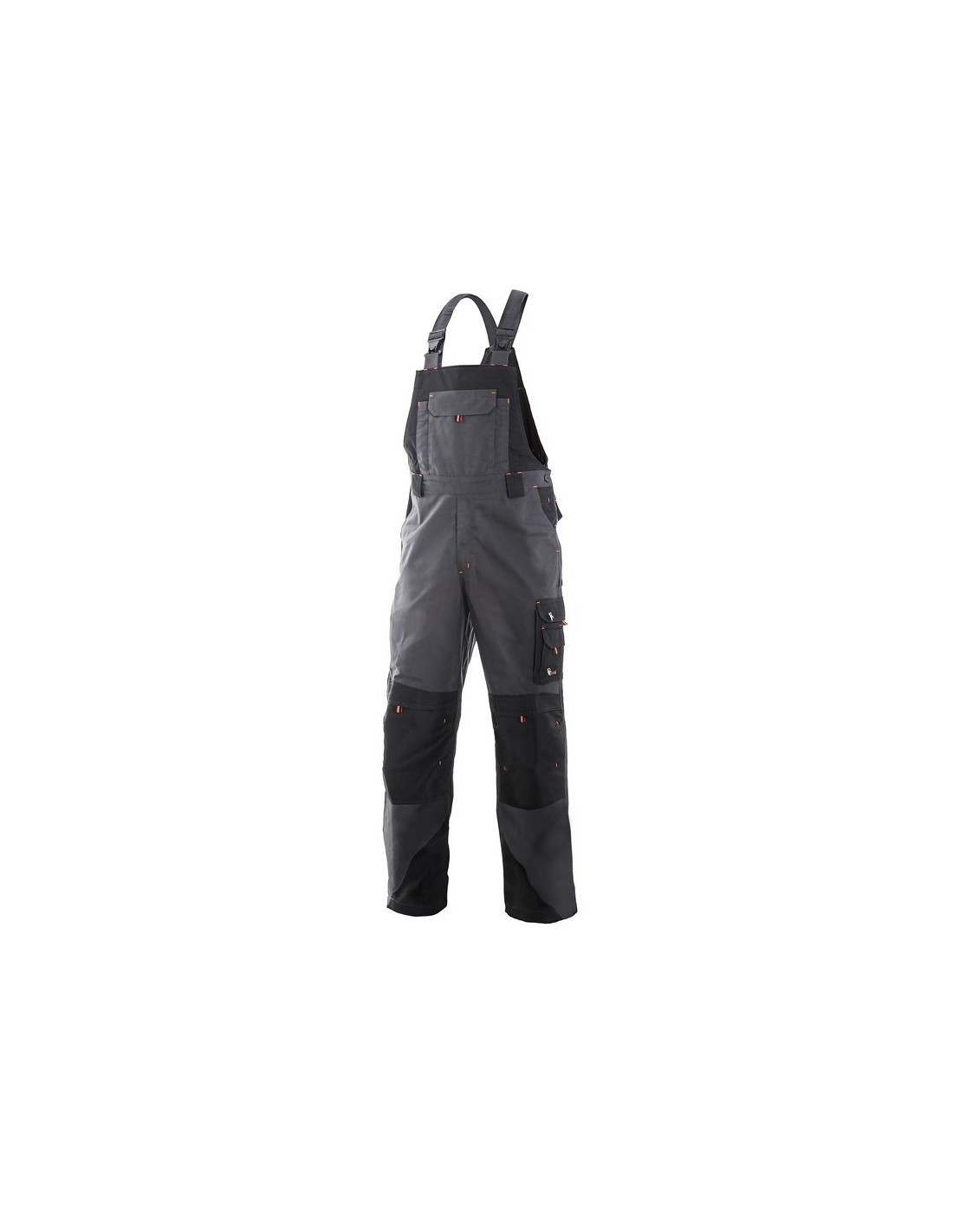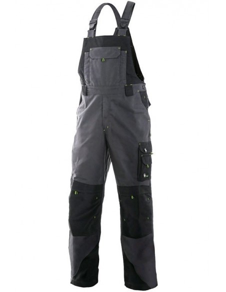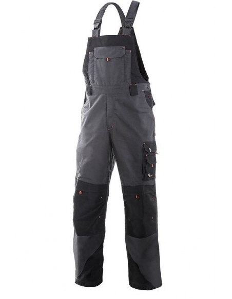 Pantaloni de lucru cu pieptar, confecționați din amestec canvas 35% bumbac cu 65% poliester, densitate material 270g/mp, talie cu găici de curea, buzunare frontale, buzunare multifuncționale pe ambele părți, zonele genunchi și glezne întărite cu poliester 600D, cu deschidere pentru genunchiere, două buzunare cu clapetă la spate, culori: gri-negru-portocaliu, gri-negru-verde