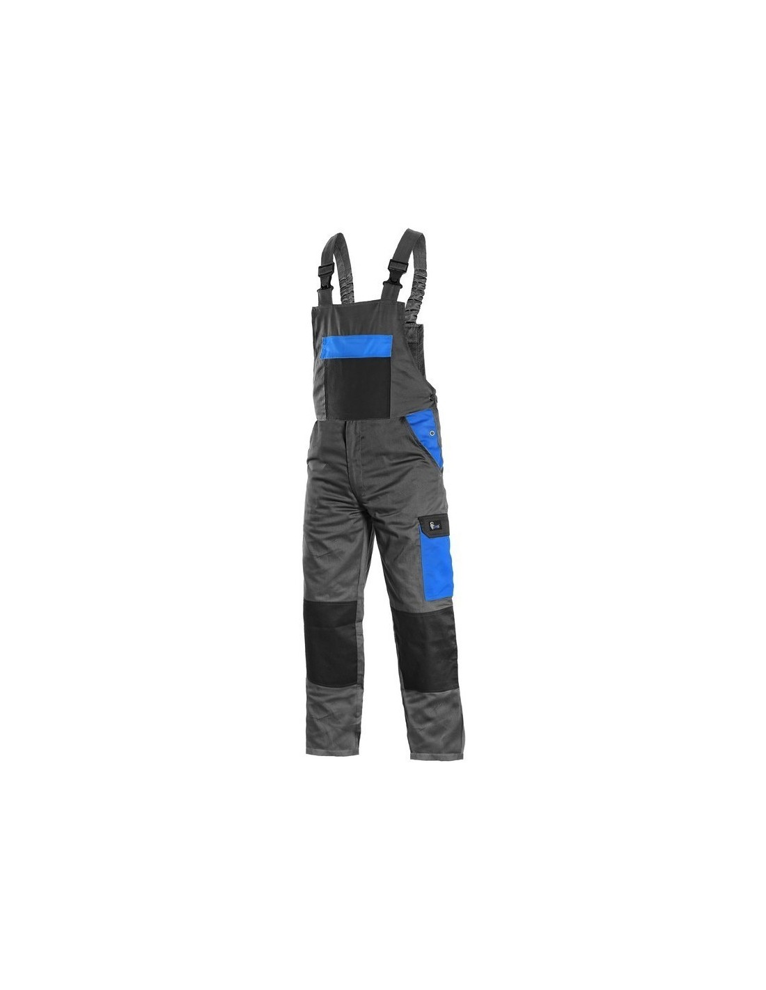 Pantaloni de lucru cu pieptar, confecționați din amestec twill 35% bumbac cu 65% poliester, densitate material 190g/mp, talie cu găici de curea, buzunare frontale, buzunar cu clapetă pe lateral, genunchi întăriți, buzunar simplu la spate, culori: gri-negru-albastru, gri-negru, gri-negru-roșu, gri-negru-galben