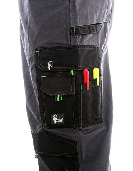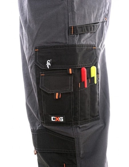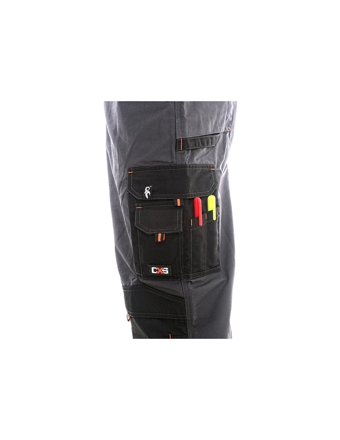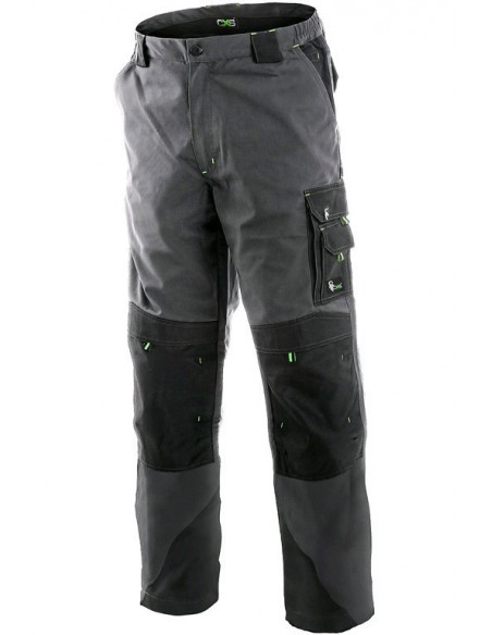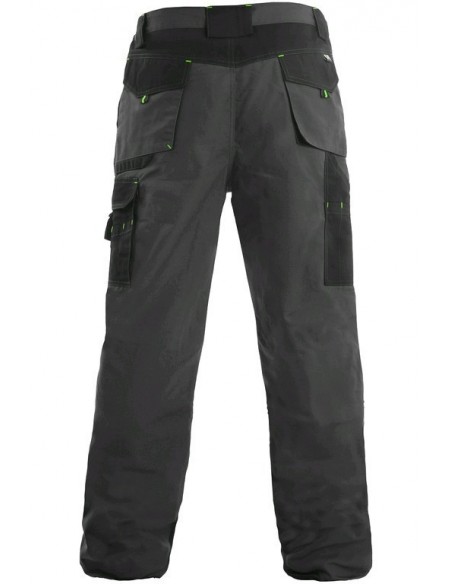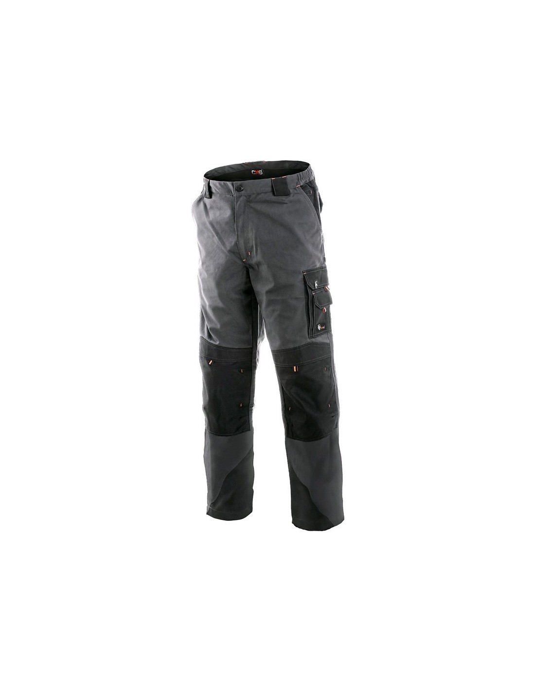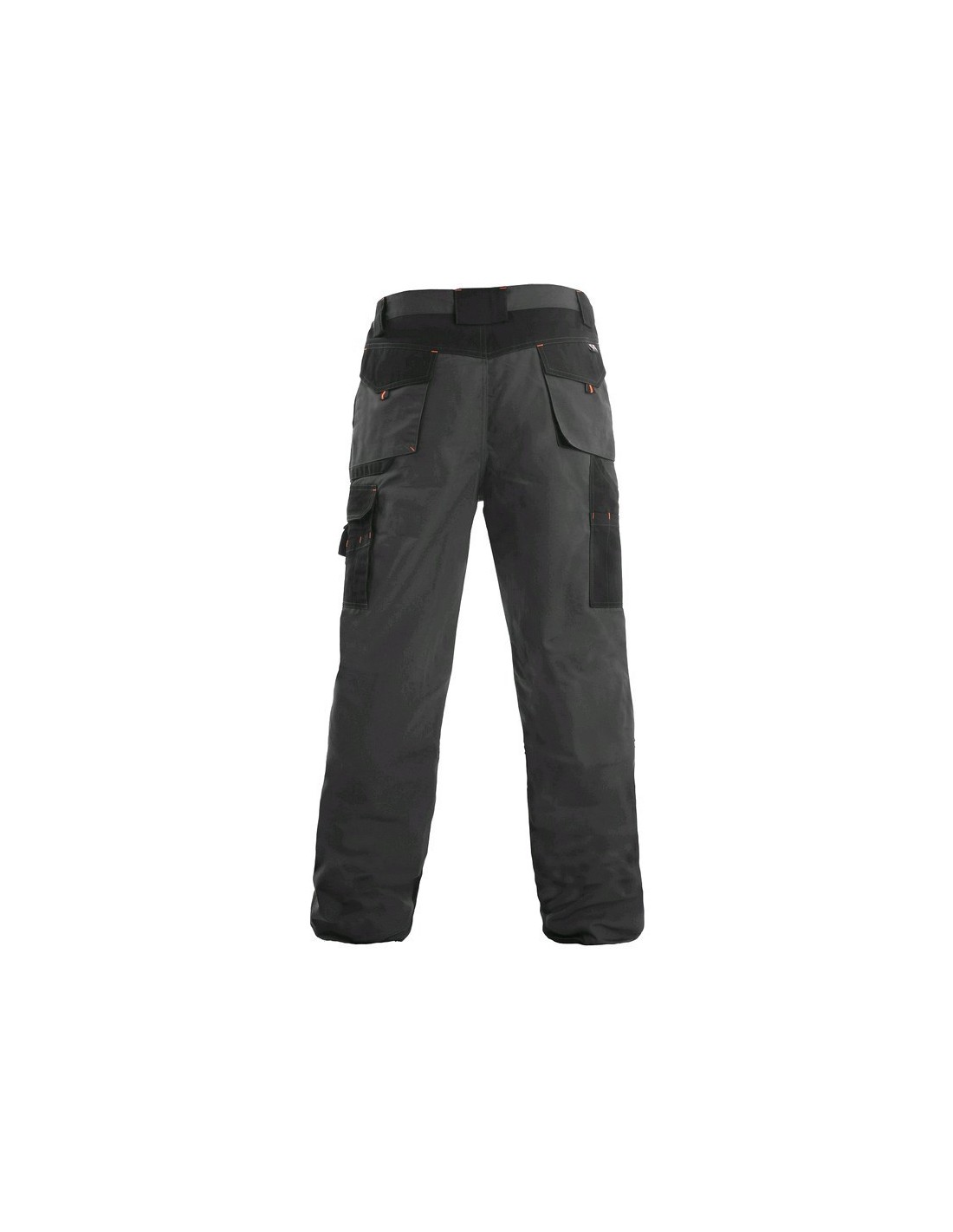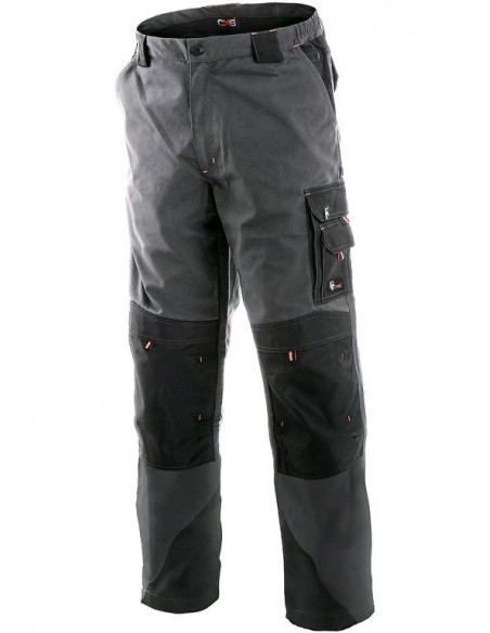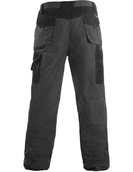 Pantaloni de lucru în talie, confecționați din amestec canvas 35% bumbac cu 65% poliester, densitate material 270g/mp, talie cu găici de curea, buzunare frontale, buzunare multifuncționale pe ambele părți, zonele genunchi și glezne întărite cu poliester 600D, cu deschidere pentru genunchiere, două buzunare cu clapetă la spate, culori: gri-negru-portocaliu, gri-negru-verde