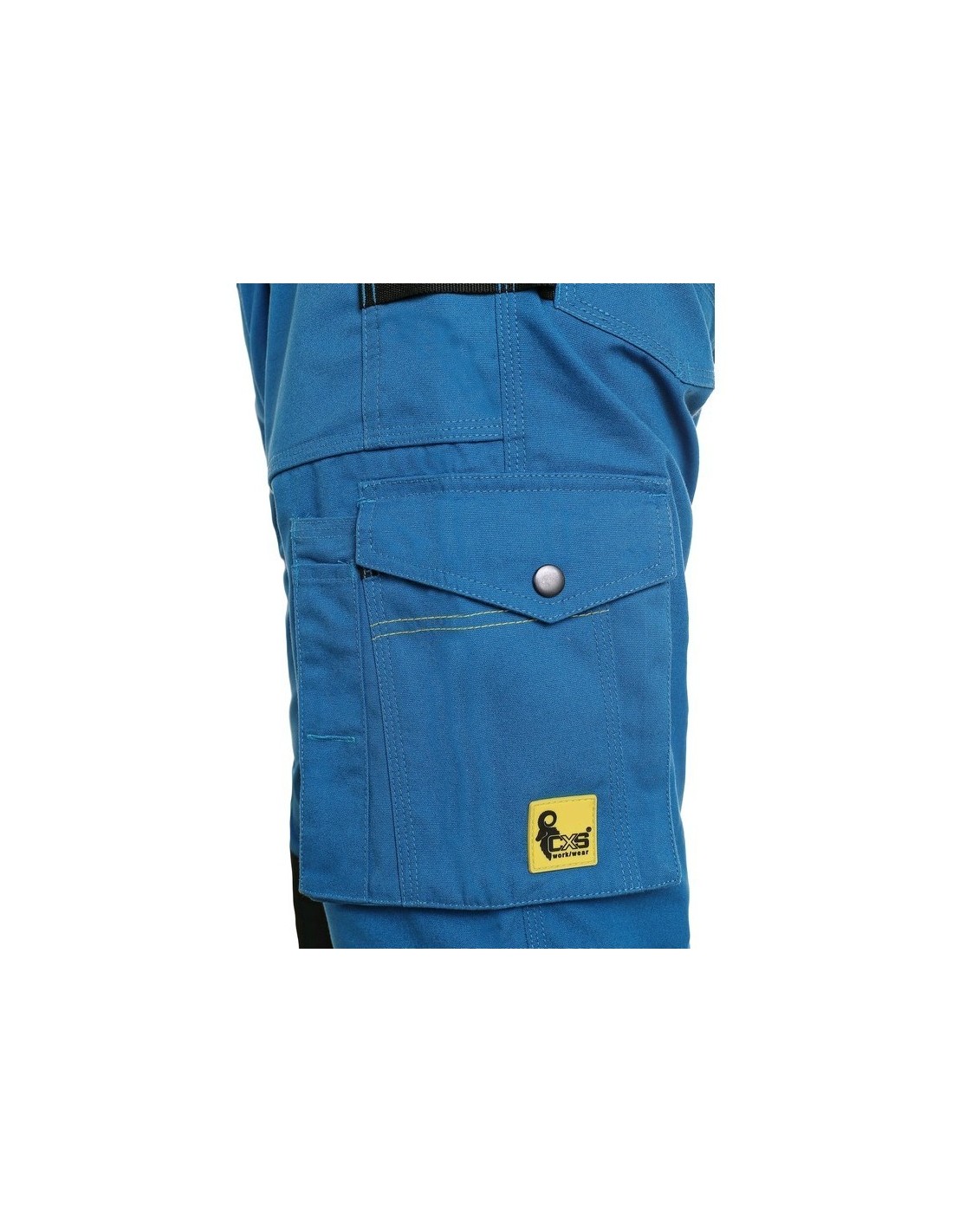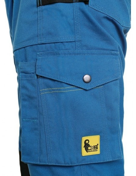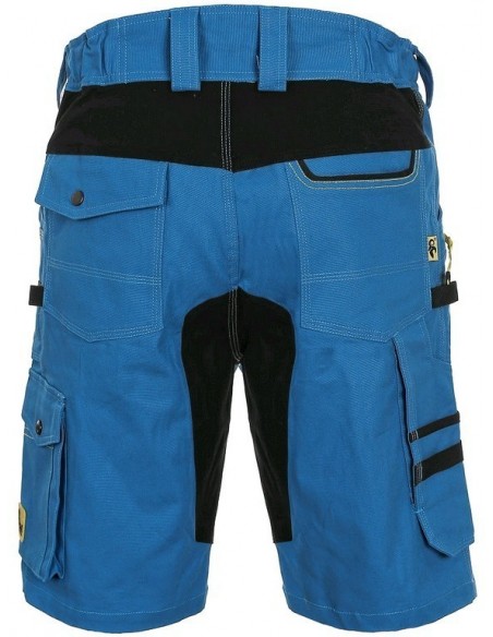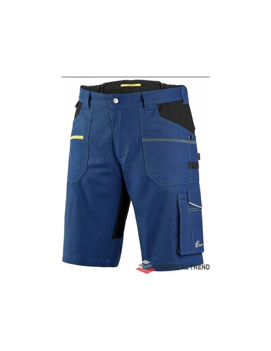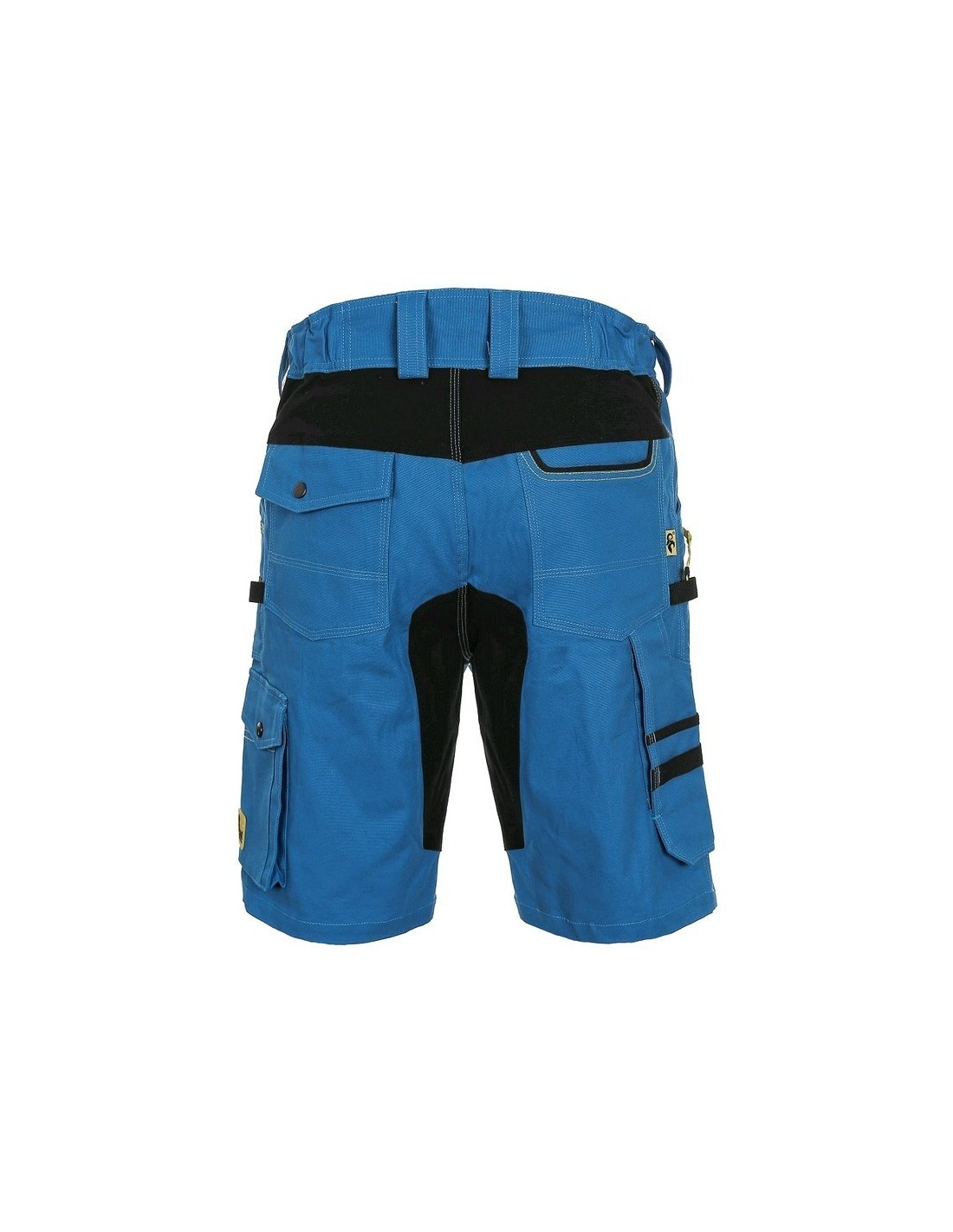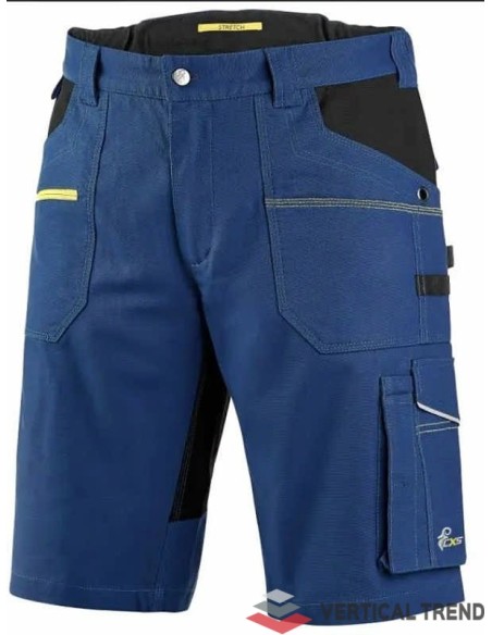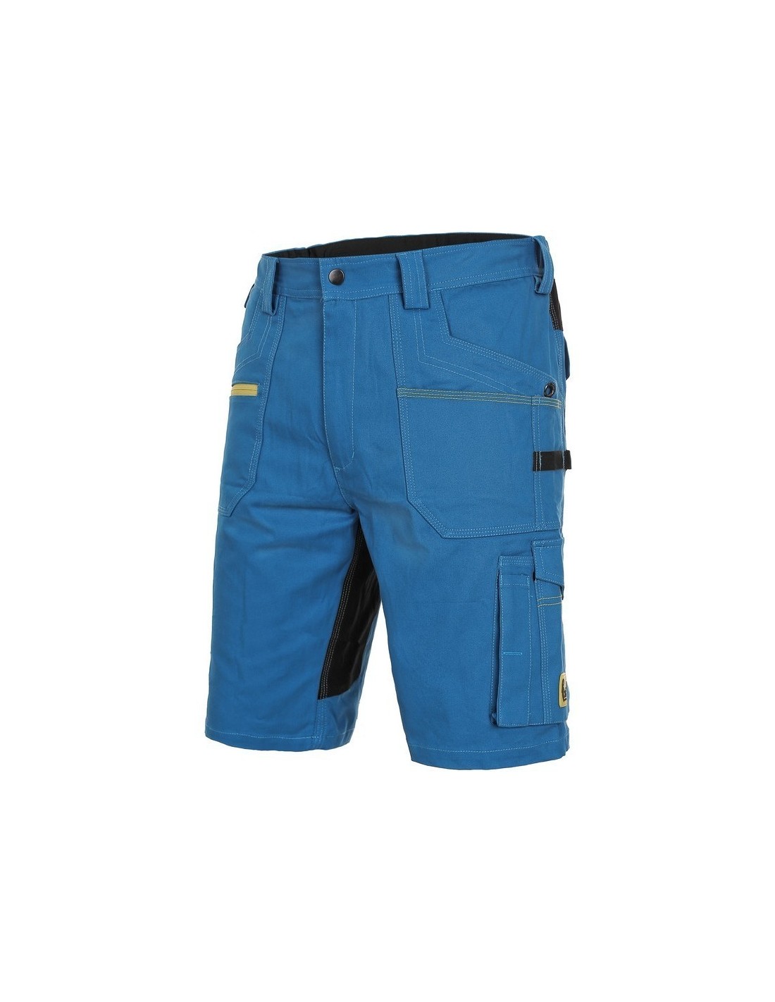 Pantaloni de lucru scurți, pentru vară, confecționați din amestec usor elastic canvas 98% bumbac cu 2% elastan, densitate material 250g/mp, talie cu găici de curea, buzunare frontale cu buzunar cu fermoar, buzunare multifuncționale pe ambele părți, două buzunare la spate - unul cu clapă , accesorii reflectorizante, culori: albastru-negru